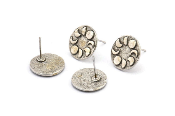 Antique Silver Plated Brass Moon Phases Shaped Round Stud Earrings
