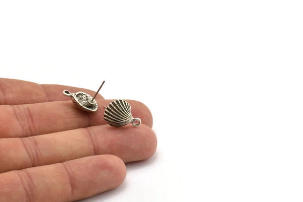 Antique Silver Plated Brass Sea Shell Stud Earrings With 1 Loop