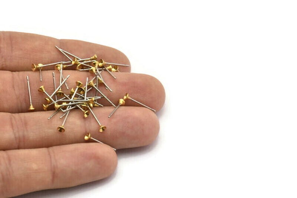 Stainless Post with Cup Pad, 100 Stainless Steel Earring Posts With Raw Brass 3mm Cup, Bowl Pad, Ear Stud Y030
