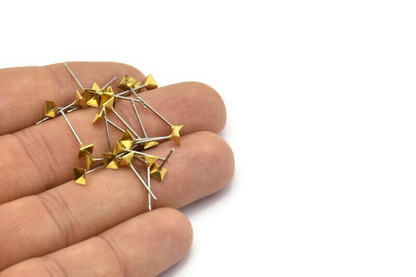 Stainless Steel Post, 50 Stainless Steel Earring Posts With Raw Brass 4x4mm Pyramid Pad, Ear Studs Bs 1248