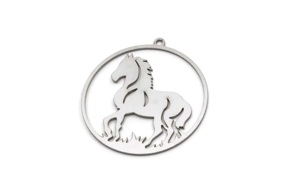 Steel Round Charm, 4 Stainless Steel Horse Patterned Charms With 1 Loop, For Jewelry Making (32x30x0.80mm) SMP3005