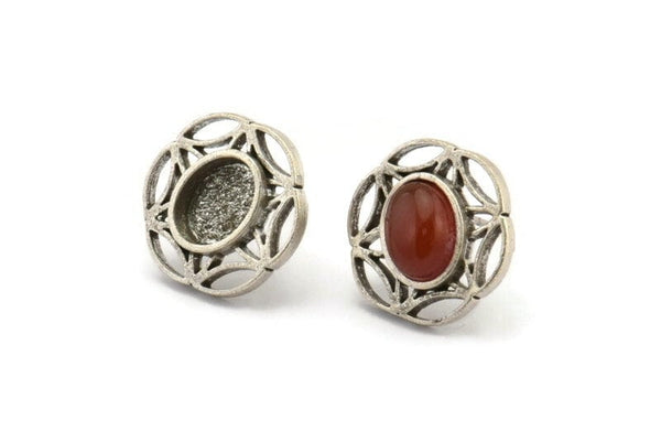Antik Gümüş Kaplama Pirinç Çiçek Küpe - 1 Oval Şekilli Taş - 8x6mm Ped Boyutu