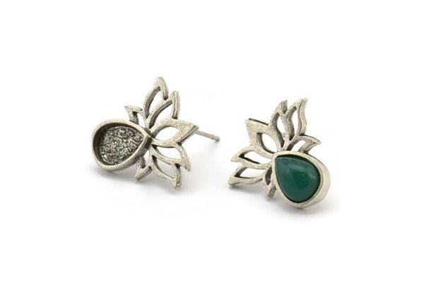 Antik Gümüş Kaplama Pirinç Lotus Çiçeği Küpe 1 Damla Şekilli Taşlı - Ped Boyutu 8x6mm