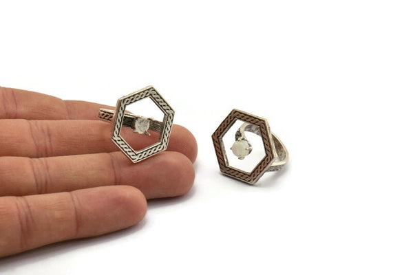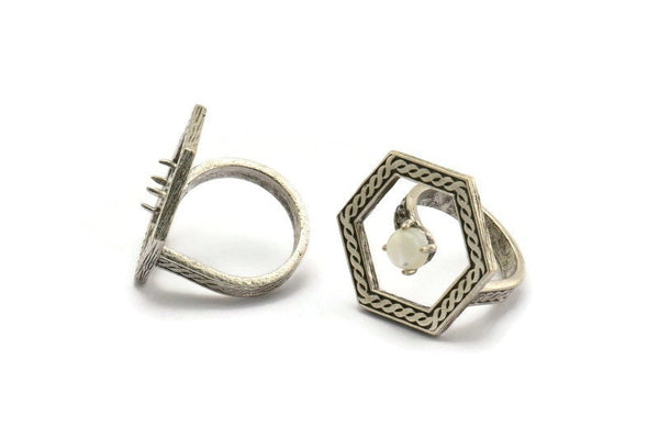 Gümüş Yüzük Ayarları, 1 Taşlı Antik Gümüş Kaplama Pirinç Altıgen Yüzük - Ped Boyutu 6 mm N2284 H1612
