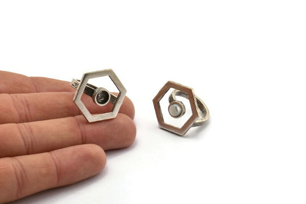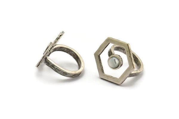 Gümüş Yüzük Ayarları, 1 Taşlı Antik Gümüş Kaplama Pirinç Altıgen Yüzük - Ped Boyutu 6mm N2289 H1602