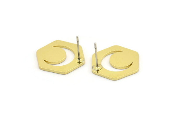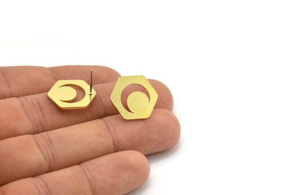 Pirinç Altıgen Küpe, 6 Ham Pirinç Hilal Desenli Altıgen Şekilli Küpe (18x16x1mm) A3756